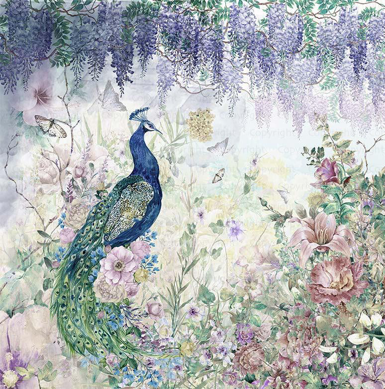 Peacock Forest Wall Mural, Blue Scenic Non-Woven Nature Theme Large Wall Poster, Non-Adhesive Modern Jungle Wall Art