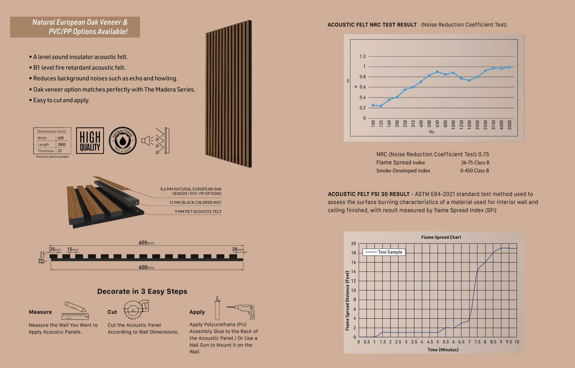 Each panel features precisely spaced oak wood slats for a clean, linear look, with sound-absorbing felt backing to reduce noise and improve acoustics. The result is a balance of beauty and functionality, perfect for home offices, living areas, restaurants, lobbies, and more.