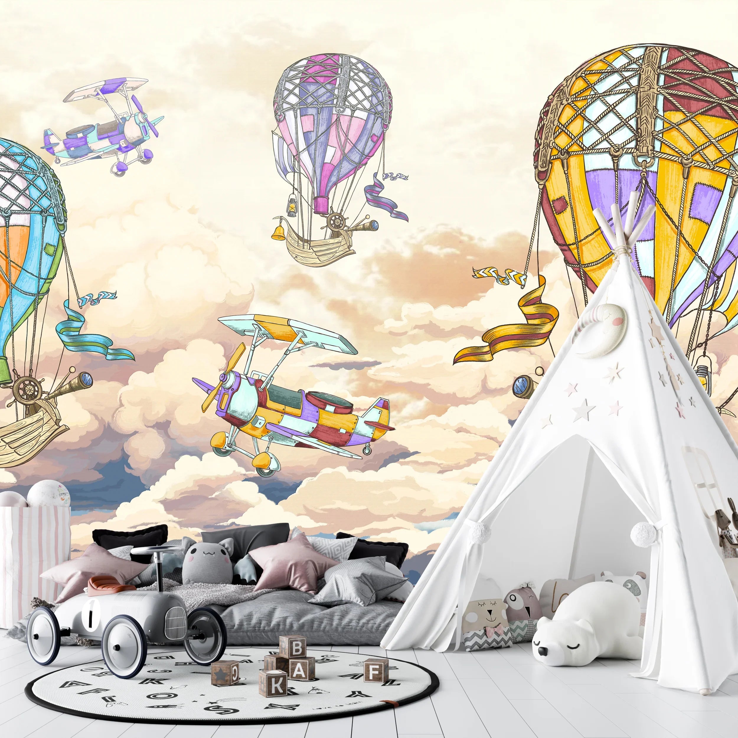 Colorful Balloons Wallpaper, Airplanes Mural, Oversized Custom Size Wall Art, Non-Woven, Non-Adhesive, Modern Wall Paper, Removable